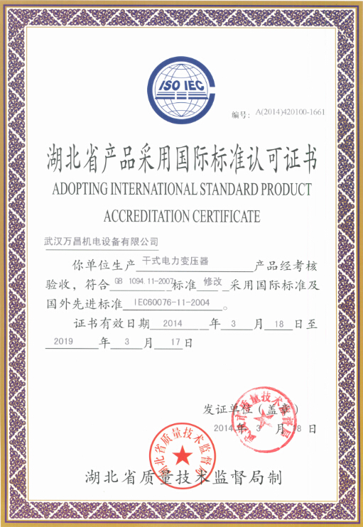 湖北省產(chǎn)品采用國際標準認可證書(干變)