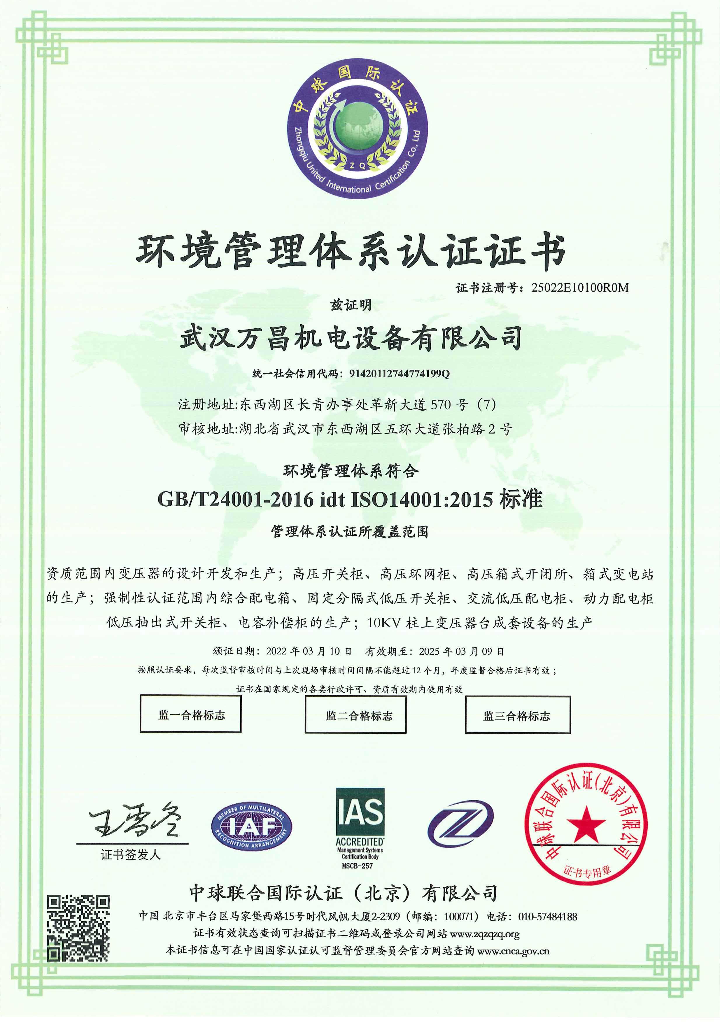 環(huán)境管理體系認(rèn)證證書